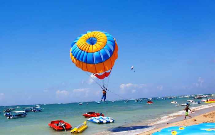 Kali ini, wahana atraksi yang bisa kamu coba dan rasakan keseruannya adalah parasailing di Tanjung Benoa, Kecamatan Kuta Selatan, Bali. Parasailing adalah kegiatan permainan yang mirip dengan paralayang. Jika, paralayang meluncur dengan kaki melalui bukit, parasailing diterbangkan melalui tarikan perahu maupun speedboat.