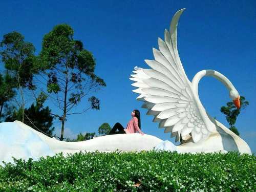 Ada berbagai macam spot foto yang jadi andalan di taman langit seperti angsa raksasa, pondok di atas pohon, hingga tempat tidur beralas rumput yang lembut.